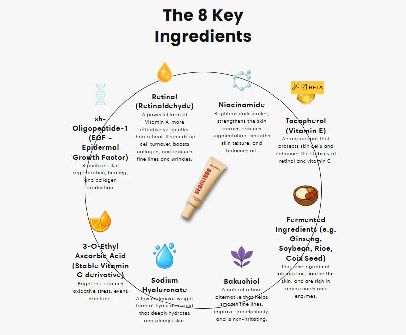 This product contains retinal encapsulated in liposomes, which improves stability and penetration. “4% retinal liposome” typically equals about 0.04% pure retinal—a gentle but effective dose for beginners.